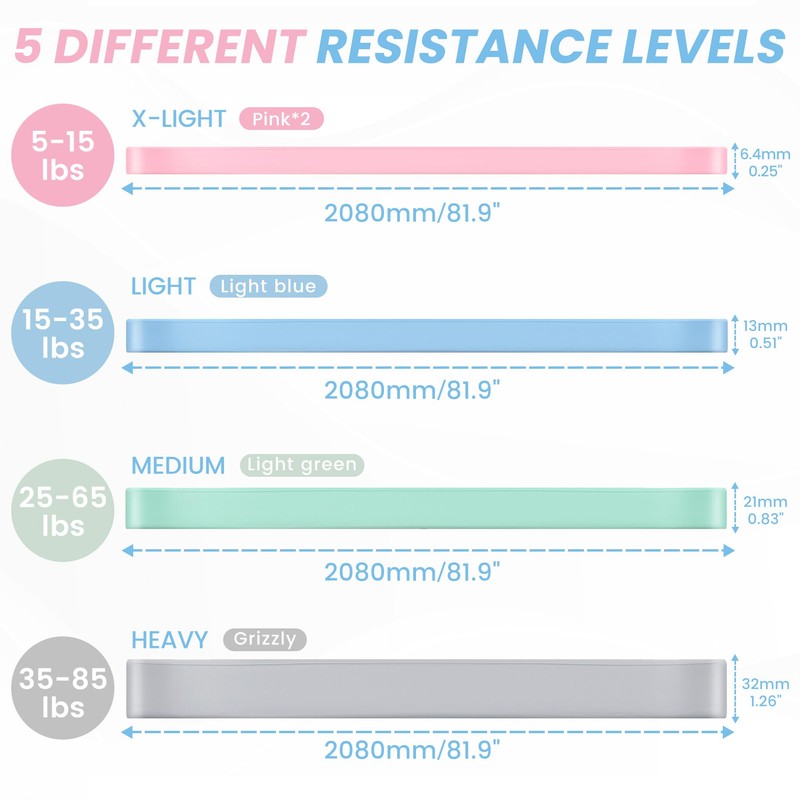 - [5 Resistance levels]: Pink(5-15 lbs) and blue(15-35 lbs) are suitable for pre-workout warming. Green(25-65 lbs) and gray(35-85 lbs) are prefect bands for body shaping. Our bands are perfect for learning, pilates, yoga, stretching, physical therapy