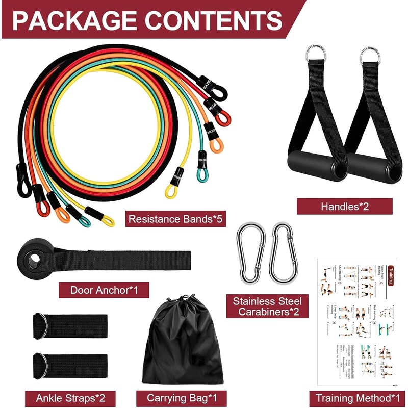 - 【Easy to Carry, Workout Anywhere】The resistance band set includes 5 sports bands with different resistances, 1 door anchor, 2 sturdy handles, 2 comfortable ankle straps, 1 carrying bag.Very easy to install and remove, the lightweight and portable design allows you to store it away without taking up space. Whether at home, in the gym, or when traveling, you can continue to use it for exercise anytime, anywhere.