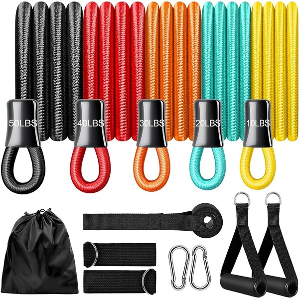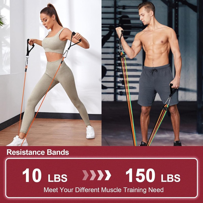 - 【Upgrade Resistance Band Set 】The exercise bands are 5 different colors with different resistance levels: 10lbs, 20lbs, 30lbs, 40lbs and 50lbs, All exercise bands resistance are 1.6m in length, Maximum weight up to 150 lbs, Easily adjust the level of resistance needed to accommodate the intensity of different exercises. Our exercise bands resistance bands set will meet all your workout needs!