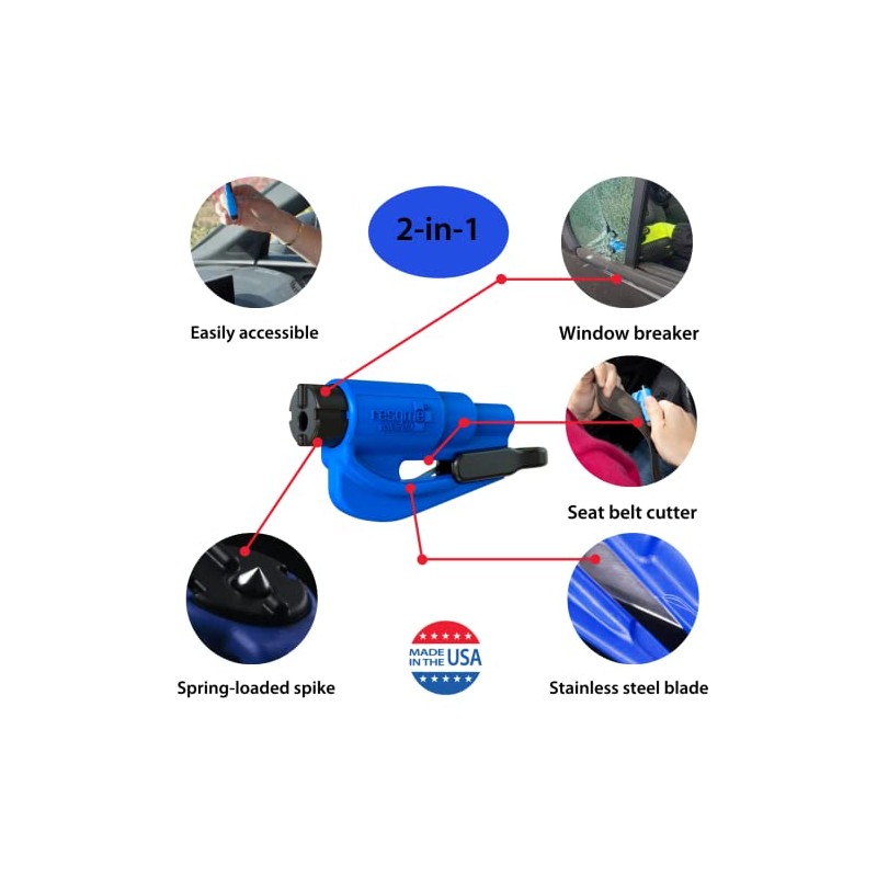 Made in USA, this 2-in-1, safety and survival tool, allows you to cut a jammed seatbelt and to break a side window in your car.Originally developed for first responders (firefighters EMTs, law enforcement agencies); resqme has become an essential safety solution for all safety-conscious drivers.Over 6 Million Motorists Worldwide Carry resqme