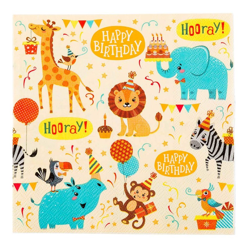 - EFFORTLESSLY COMPLEMENTS PARTY DECOR: These cocktail party napkins read "HAPPY BIRTHDAY" and "HOOray!" and have a variety of jungle animals printed on them to match the decor at any event.