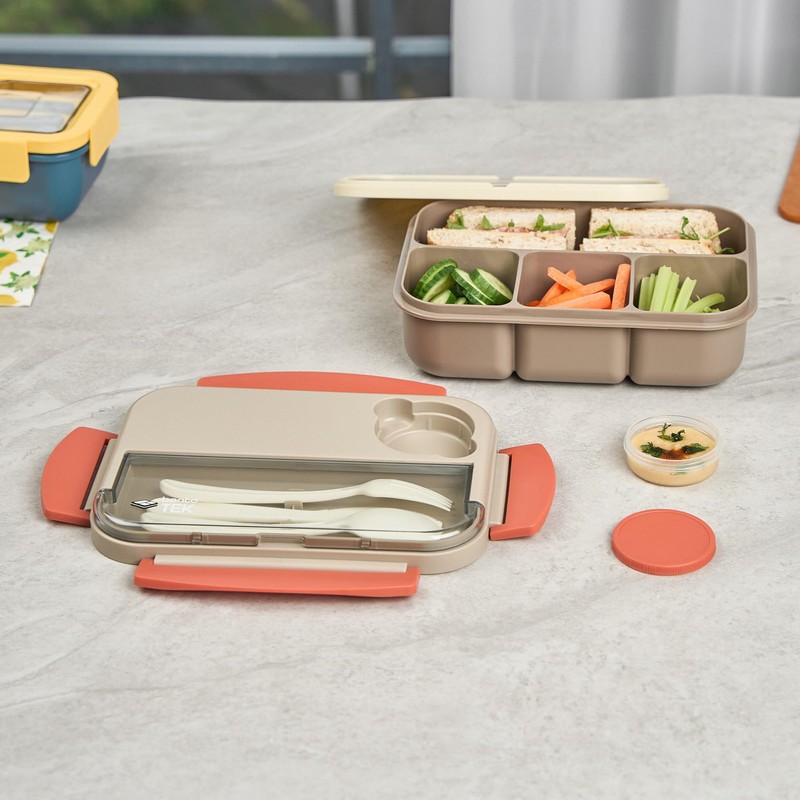 - INCLUDED CUTLERY: Equipped with a reusable fork, spoon, and knife, these food storage containers make it easy to enjoy meals on the go. Their sauce bowls are ideal for carrying dressings or dips.
