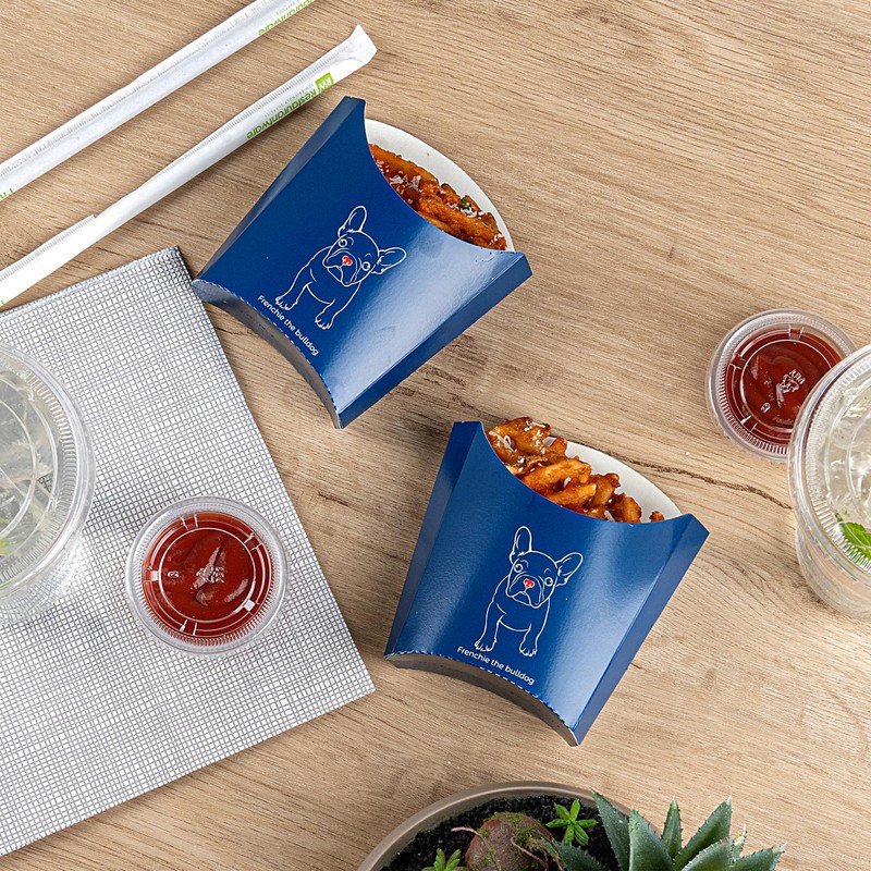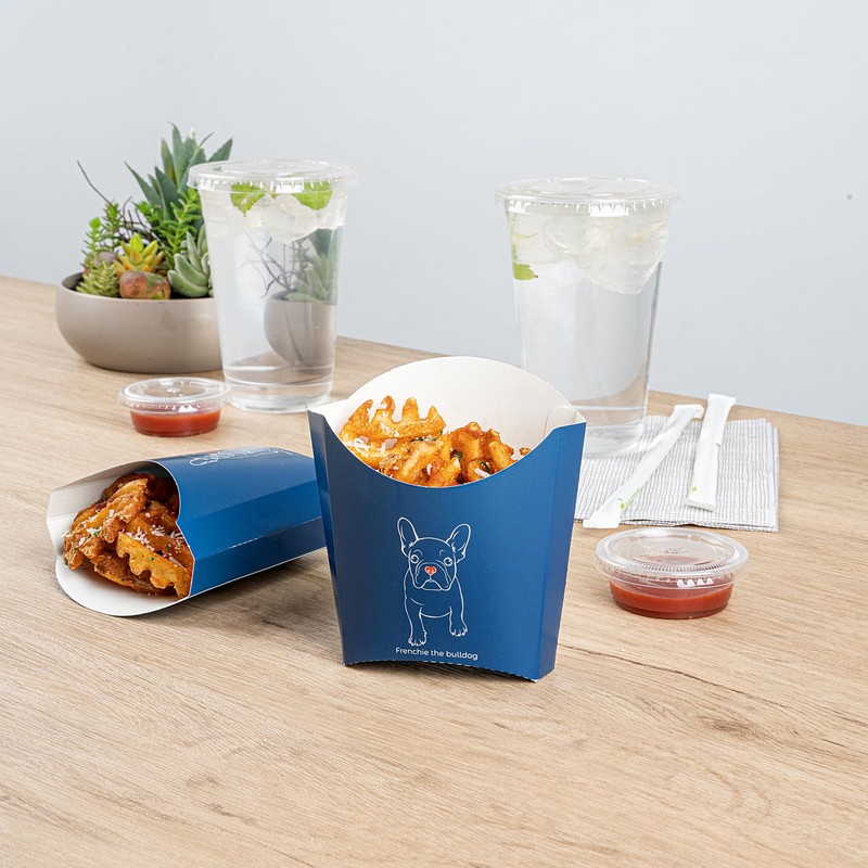 - STRONG & STURDY: Built from premium paper, these fries holders are strong and sturdy so guests can carry their snacks while on the go. Plus, their Frenchie finish gives treats a stylish look.
