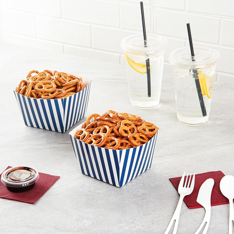 - STYLISH LOOK: Featuring blue and white stripes, these paper food containers give your baked goods an elegant appearance. They're also great as goodie bags for birthday parties and other events.