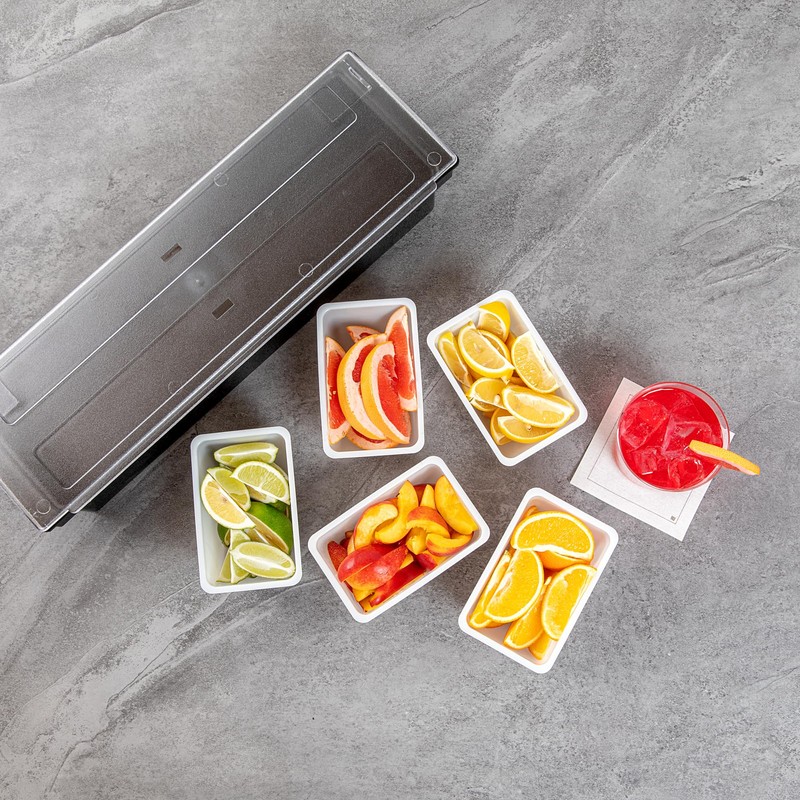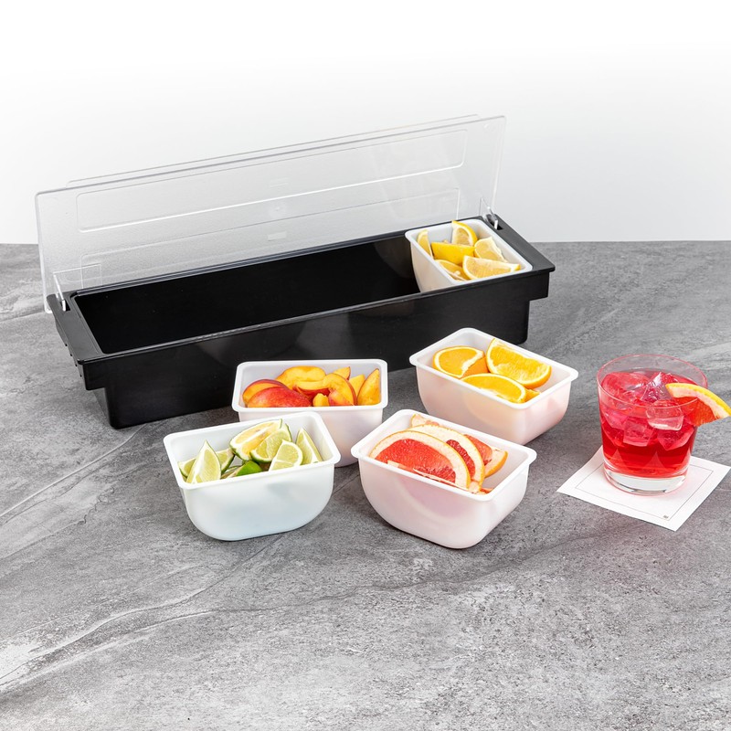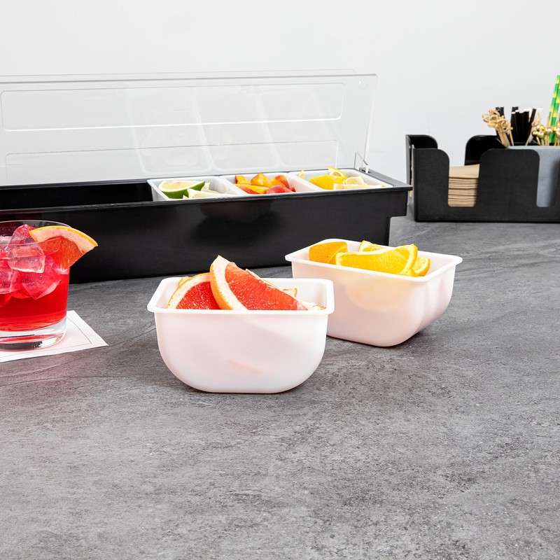 • INCLUDES 5 CADDY INSERTS: Measuring 5.5 inches long by 3.5 inches wide by 2.8 tall, these white plastic containers can hold up to 1.2 pints. You will receive 5 garnish containers per order.