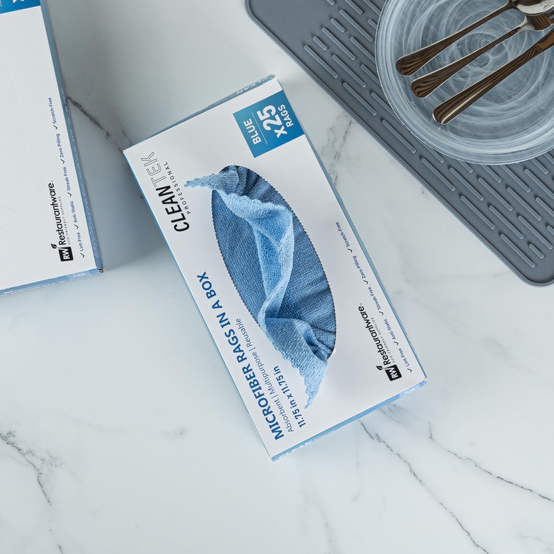Restaurantware Clean Tek Professional 11.81 x 11.81 Inch Microfiber Rags in a Box, 25 Absorbent Cleaning Cloths - No-Scratch, Blue Microfiber Reusable Edgeless Cleaning Towels, Leaves No Streak