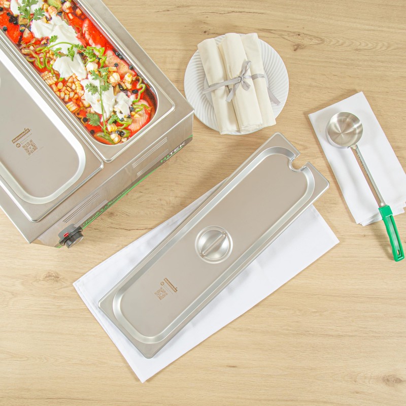 - EFFORTLESS ACCESSIBILITY: The flat, center handles of these hotel pan covers facilitates easy access. An open slot offers convenient space to store ladles without exposing the contents of the pan.