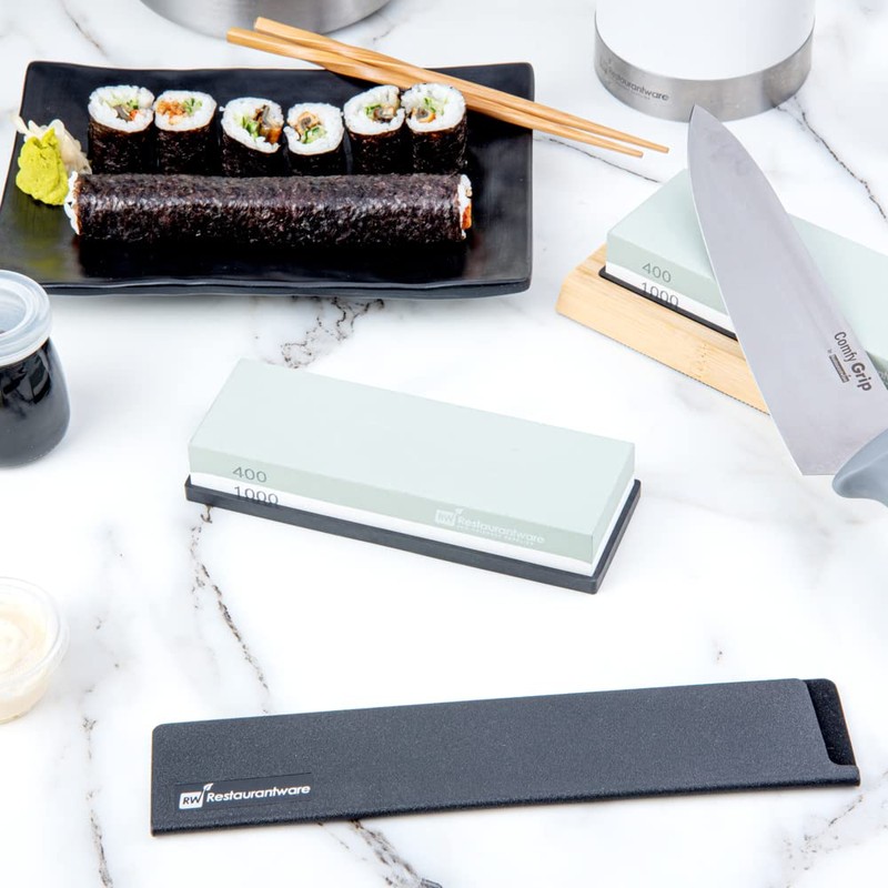 Restaurantware Sensei 7.1 x 2.3 x 1.1 Inch Kitchen Knife Whetstone 1 Durable Knife Sharpening Base - Silicone Holder 400/1000 Grit Corundum Sharpening Stone For Kitchen Knives For Any Blade