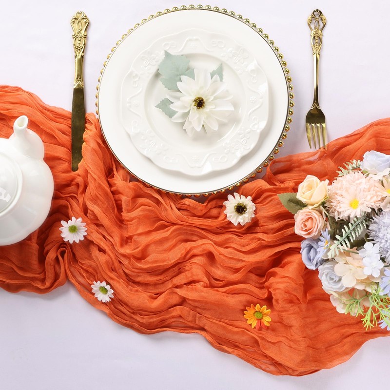 - 【Easy to Care】These orange cheese cloth table runner are skin-friendly and recommended for hand wash in cold water with mild detergent or machine wash in a laundry bag. In order to keep its crinkling texture, please do not iron it or use fabric softeners. For a long time use, please hung them up to dry, avoid bleaching or drying in direct sunlight, or their color may fade.