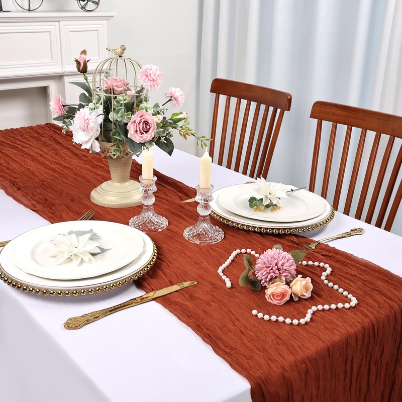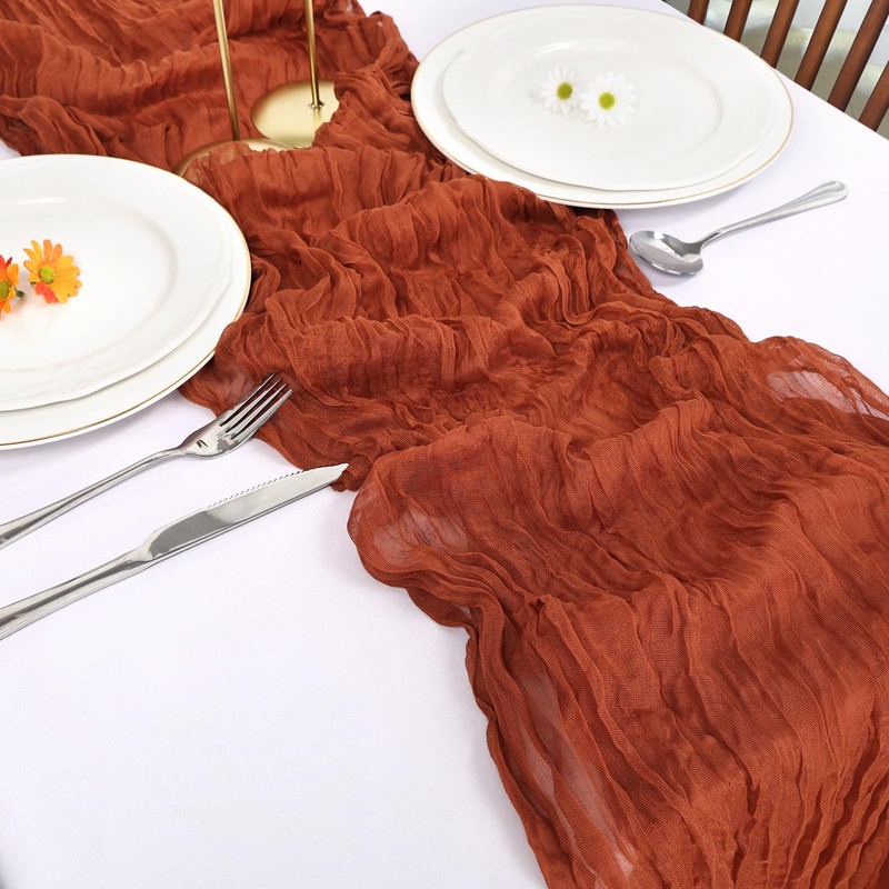 - 【Easy to Care】These terracotta cheese cloth table runner are skin-friendly and recommended for hand wash in cold water with mild detergent or machine wash in a laundry bag. In order to keep its crinkling texture, please do not iron it or use fabric softeners. For a long time use, please hung them up to dry, avoid bleaching or drying in direct sunlight, or their color may fade.