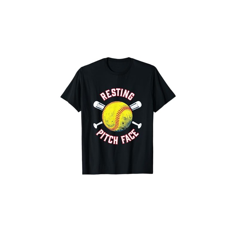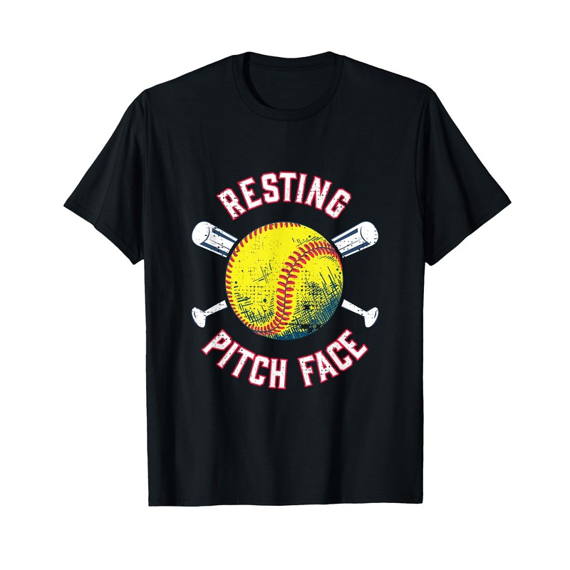 - Funny pun says "Resting Pitch Face" around a yellow softball and a pair of bats. Design is distressed for vintage style.