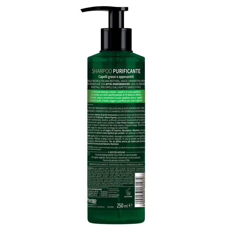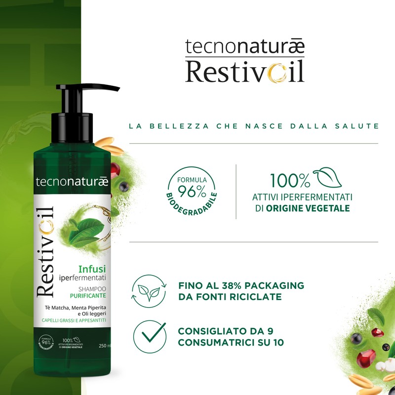 Restivoil Tecnonaturae Purifying Shampoo for Greasy and Weighted Hair with Hyper-fermented Infusions and Light Oils. FROM ITALIAN RESTIVOIL RESEARCH, THE INNOVATIVE TECNONATURÆ LINE IS BORN WITH 100% HYPERFERMENTED ACTIVES OF PLANT ORIGIN, FOR HEALTHY AND VITAL-LOOKING HAIR. The formula gently cleanses the hair and scalp. Enriched with Hyperfermented Actives of Matcha Tea and Peppermint, it helps keep the scalp healthy and the hair fresh and thoroughly cleansed, light and purified throughout the day. TRANSPARENT AND DELICATE TEXTURE WITH REFRESHING NOTES, TO MAKE SHAMPOO TIME AN EXPERIENCE OF WELLNESS. The innovative hyperfermentation system allows the extraction of the most hidden and beneficial active ingredients from Matcha Tea and Peppermint, enhancing the effectiveness of the phytocomplexes, rich in antioxidants, vitamins, polyphenols and amino acids, fundamental for the health and well-being of hair and skin scalp. The Color Protect Complex protects hair and helps reduce color fading due to frequent washing, hot tools, UV rays, salt water and protects against free radicals. The exclusive formula with light Camelina, Macadamia and Almond oils gently cleanses even the most sensitive scalp, and is suitable for frequent use. Biodegradable formula up to 96% with only surfactants of vegetable origin. Without silicones and dyes for a natural touch. Bottle made from 35% recycled plastic.