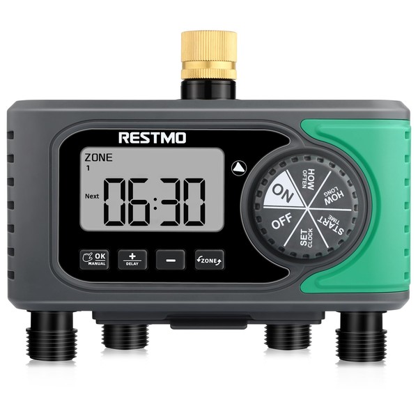 RESTMO 4-Outlet Sprinkler Timer with Brass Inlet, 4 Zone Programmable Water Timer for Garden Hose, Automatic Digital Control | Manual ON/Off | Rain Delay, for Outdoor Faucet, Drip Irrigation and Lawn