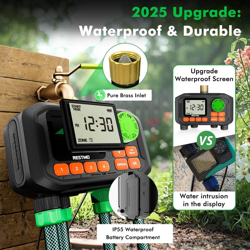 RESTMO 4 Zone Sprinkler Timer with Brass Inlet, Programmable Water Timer for Garden Hose, Automatic Control | Manual ON/Off | Rain Delay for Outdoor Faucet, Drip Irrigation and Lawn Watering System
