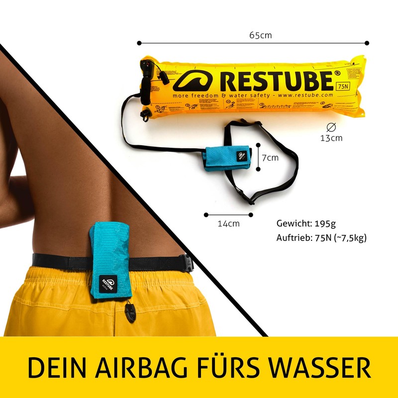 - Versatile: all water sports enthusiasts appreciate the low weight of the RESTUBE. You will only notice them when you use the 75N safety buoyancy. Easily reusable with one of the two CO2 cartridges included in this kit