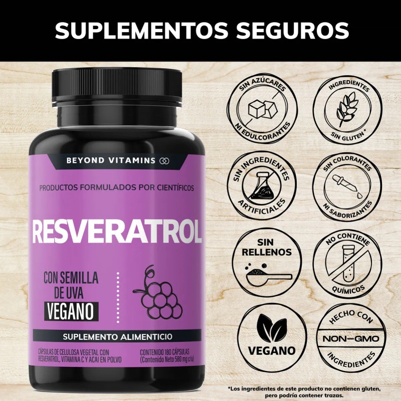 Resveratrol 100% Vegano de alto contenido en Polifenoles | Suplemento Alimenticio Con Pimienta Negra Para Mejor Absorción, Vitamina C, Semilla De Uva Y Acai Beyond Vitamins Antioxidante | 180 Capsulas