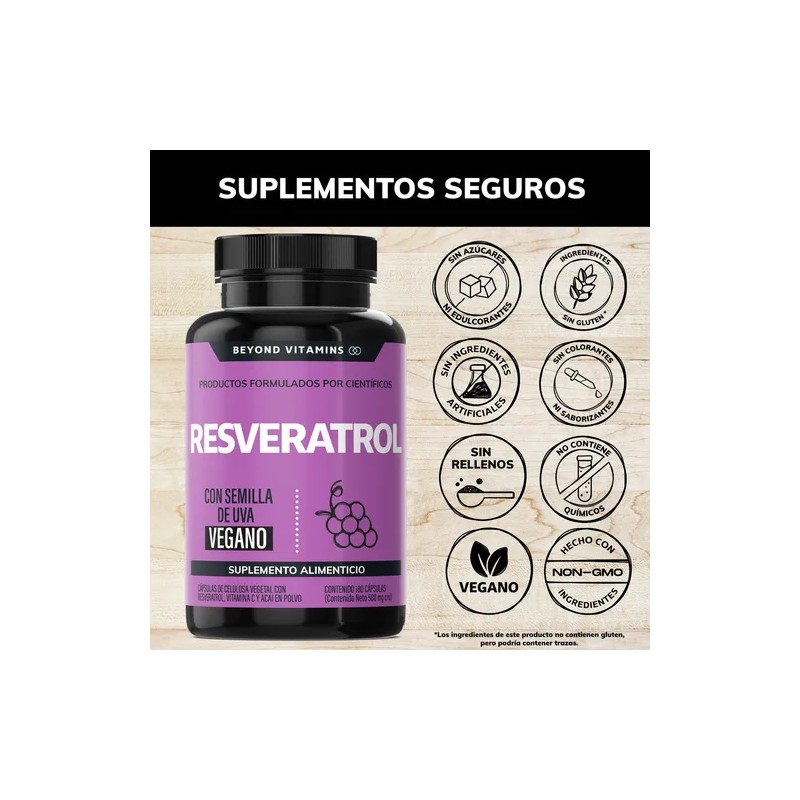 Resveratrol Beyond Vitamins contiene una combinación completa de Reveratrol, Semilla de Uva, Acai en Polvo, Vitamina C, Pimienta Negra.