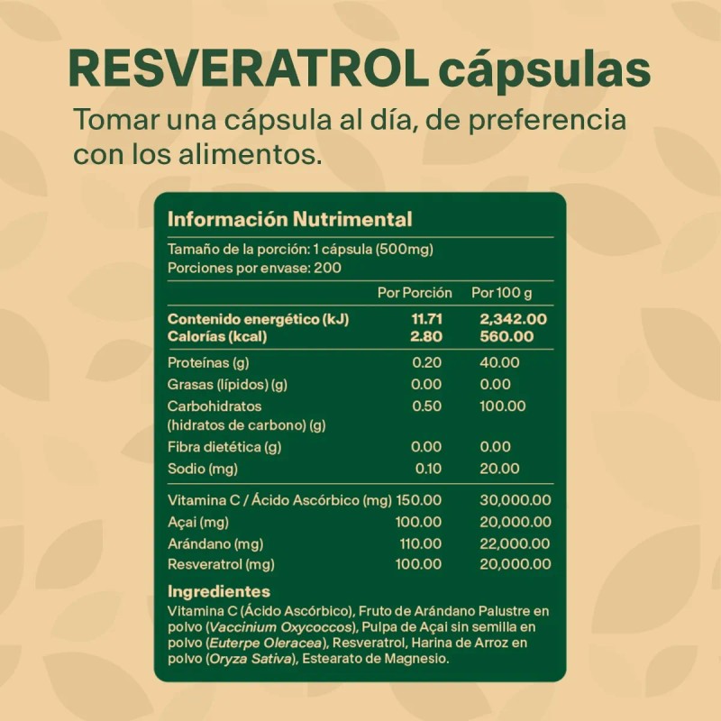 Ingredientes | Vitamina C, Resveratrol, Arandano y Acai. 200 Capsulas de 500mg.