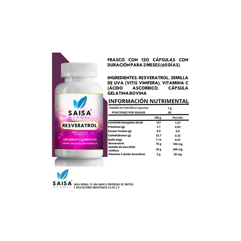 Descubre el poder del 'Resveratrol 120 Cáp Semilla De Uva Y Vitamina C' de Saisa Herbal, un suplemento alimenticio diseñado para complementar tu estilo de vida saludable. Cada frasco contiene 120 cápsulas, cada una con 700 mg de Resveratrol, un potente antioxidante que ayuda a combatir el estrés oxidativo. Además, está enriquecido con Semilla de Uva y Vitamina C, que contribuyen al bienestar general.
