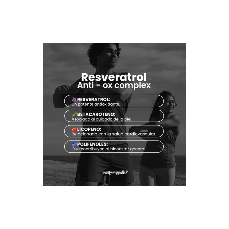 :: El resveratrol, presente naturalmente en la uva, ha sido estudiado por su potencial para apoyar la salud del corazón y el envejecimiento saludable. Su combinación con otros antioxidantes naturales potencia su efecto protector sobre las células.