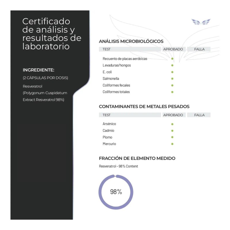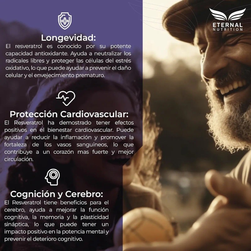 Protección Antioxidante: El resveratrol es conocido por su potente actividad antioxidante, que ayuda a neutralizar los radicales libres y reducir el estrés oxidativo en el cuerpo. Esto puede proteger las células y los tejidos del daño causado por los radicales libres, contribuyendo a la salud celular y al envejecimiento saludable.