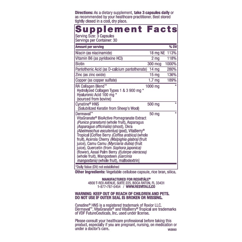 - ResVitále created a specialized blend of vital beauty proteins to support 3 markers of beauty - hair, skin and nails.* Beauty 3 is more than vitamins - it delivers key beauty proteins. Formulated to nutritionally support the structural building blocks of skin, hair and nails, our 'total beauty' solution helps promote a healthy appearance, support skin firmness and help reduce hair shedding.*Also, formulated with a unique, body ready keratin and popular beauty nutrients, Biotin and Hyaluronic