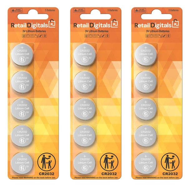 Retail Digitals CR2032 3V Premium Lithium Battery | Shelf Time 10 Years | 240 mAh | Pack of 15