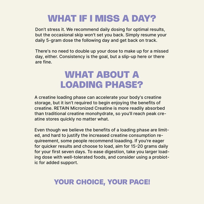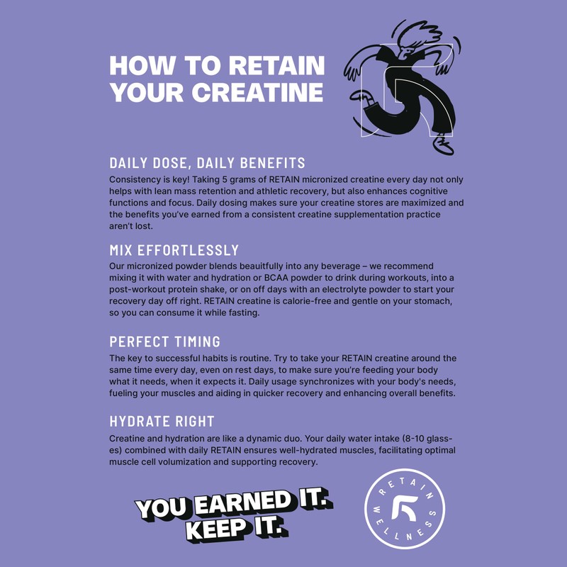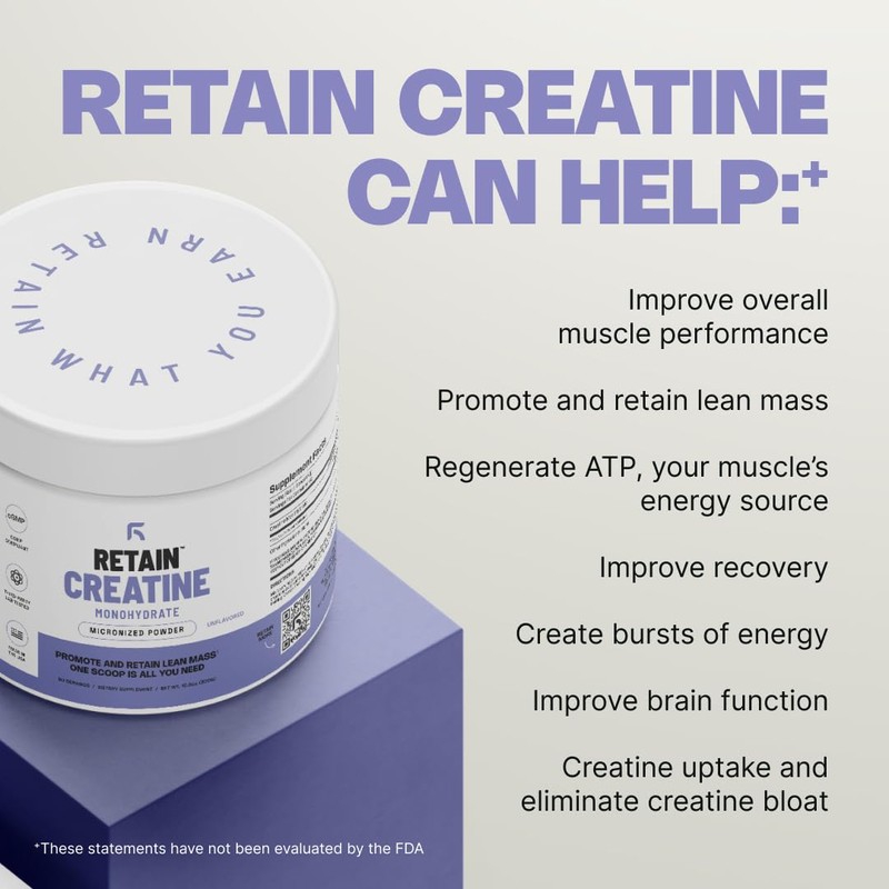 RETAIN RETAIN Creatine Monohydrate Powder (60 Serv) - 100% Micronized High Absorption Creatine Monohydrate, Lean Muscle Mass & Recovery