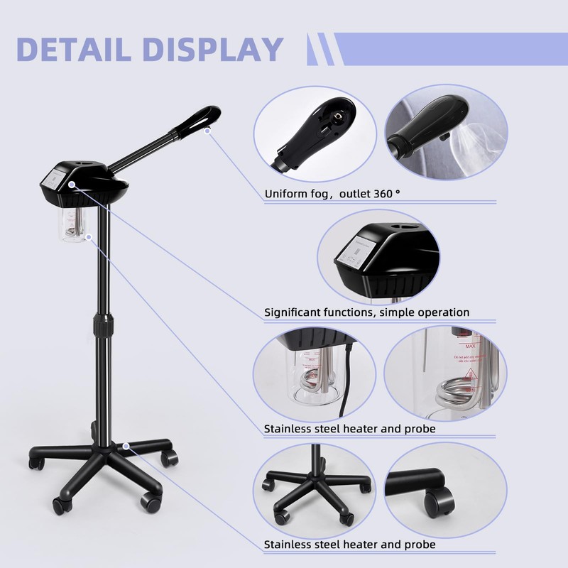 - ⭐【Little Working Voice】–Facial Steamer on wheels When moving, it is smooth and the sound is small, which will not affect the guests. The sound of the machine running in the work will be very small,After the timing ends, it will make a tinkling prompt!