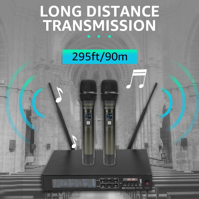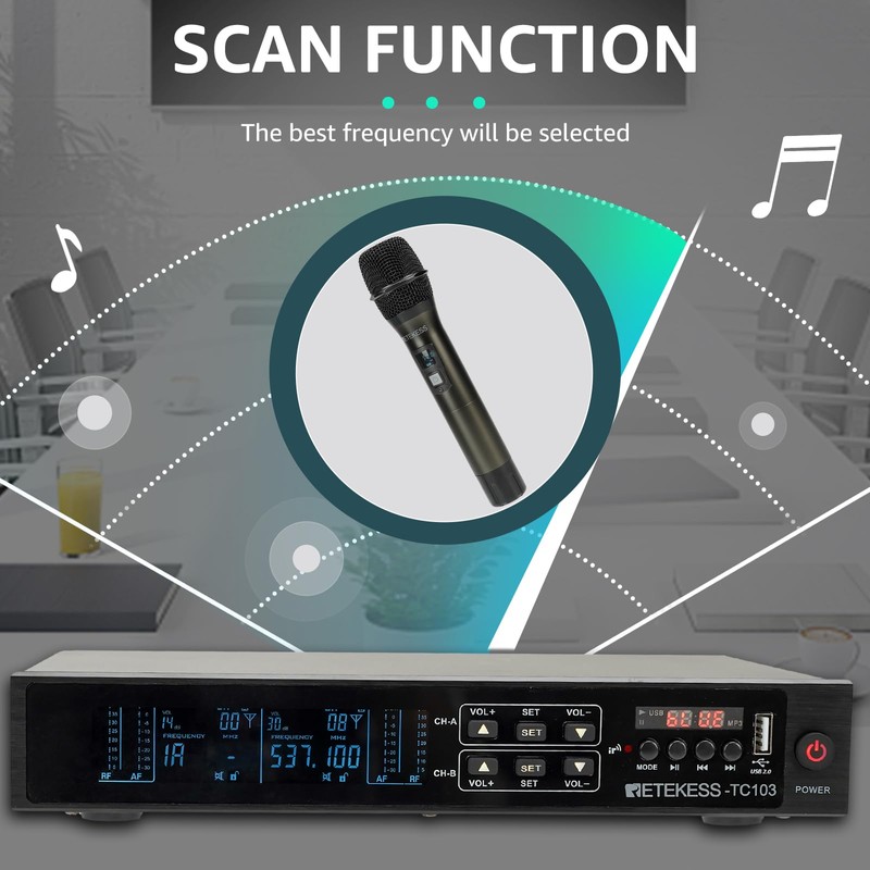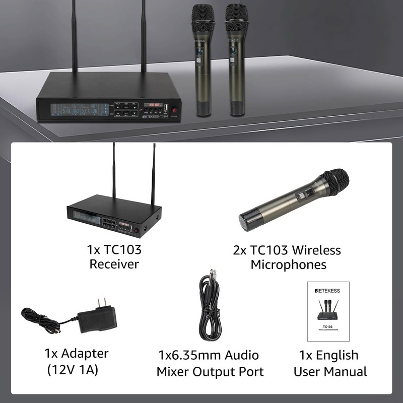 Retekess TC103 wireless microphone has dynamic high-fidelity speakers to ensure high sound quality. It is easy to use, even if you are a new hand, you can use it without stress. Long-distance transmission, even if the venue is large, you don't have to worry about being disconnected. Features: Auto Mute 2×100 Frequency Channels USB MP3 play Scan Function wireless-compatible V5.0 Auto-Tuning: Automatic Frequency Search and ACT Function Real-time Battery Level Display Complete Interfaces: 2×XLR Interfaces + 6.35mm Audio Mixer Output Port Multi-function Screen: Displays real-time signal strength, audio dynamics, electronic volume levels, and operating frequency