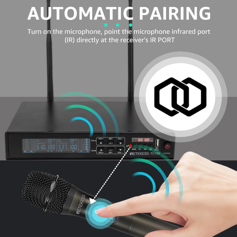 • Automatic mute; after Retekess TC103 wireless DJ microphone system is put down; it automatically sleeps and automatically mutes; providing additional convenience and flexibility; intelligently meeting your needs