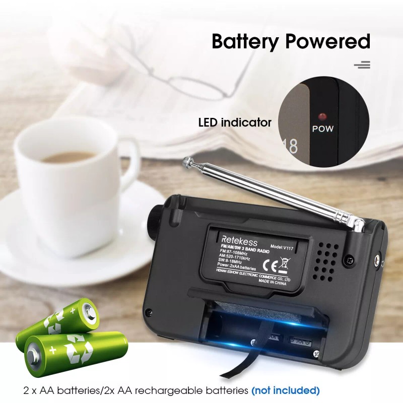 Retekess V117 Portable FM/AM/SW Radio 3 Band Receiver Emergency Radio Battery Powered