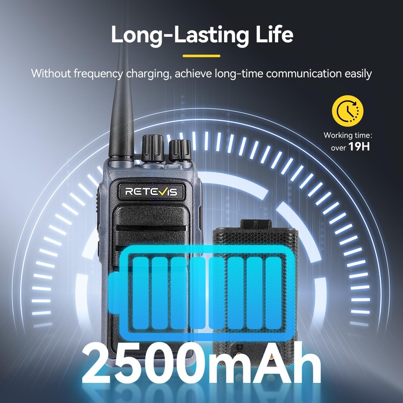 • Stay connected longer: experience two way radio with a 2500mAh battery; delivering a usage time of 19 hours; empower you to stay connected throughout extended shifts; meetings; or other activities; ensures you're always ready to respond