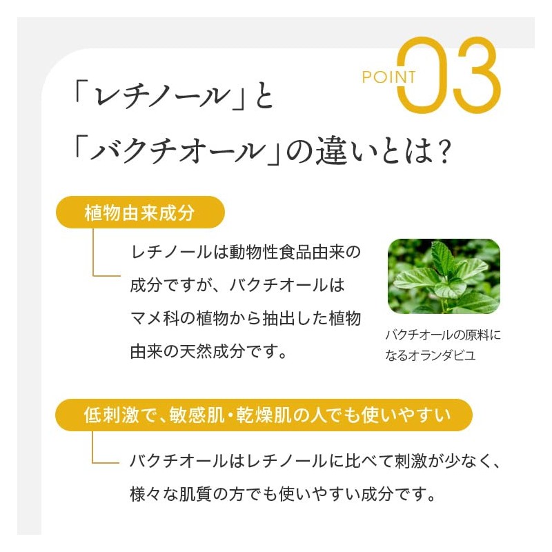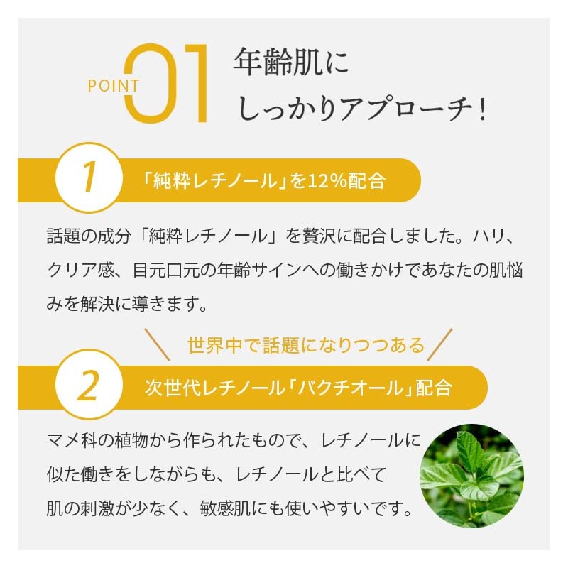 - (Point 01 – Approach to aging skin! ~) Formulated with 4% pure retinol & Bacctiol. 1. A luxurious blend of pure retinol, a hot topic ingredient. Help you solve your skin problems by working with the crisp, clear feeling and age signs at the mouth of your eyes. 2. Formulated with the next generation retinol "Baxtiol" "Bacttiol" is a plant made from a lithography family, and it works similar to retinol, but has less skin irritation compared to retinol, and is hypoallergenic for sensitive skin