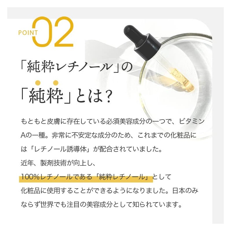 - What is pure retinol pure ? Retinol is one of the essential beauty ingredients that are naturally present on the skin, and is a type of vitamin A. Retinol is a very unstable ingredient, so it has been formulated with retinol derivatives. In recent years, the formulation technology has been improved, making it possible to be used in cosmetics as a 100% retinol "pure retinol". It is known as a beauty ingredient that attracts attention in Japan and the world