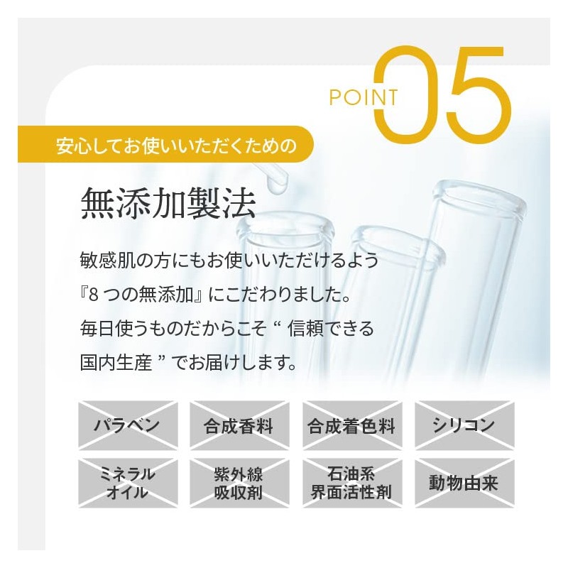 - (Point 05 - 8 Free) We have created a commitment to 8 types of grains, so it can be used for all skin types. We deliver reliable domestic production because we use it every day. Paraben x Synthetic Fragrance x Synthetic Coloring x Silicone x Mineral Oil x UV Absorbent x Petroleum Surfactant x Animal