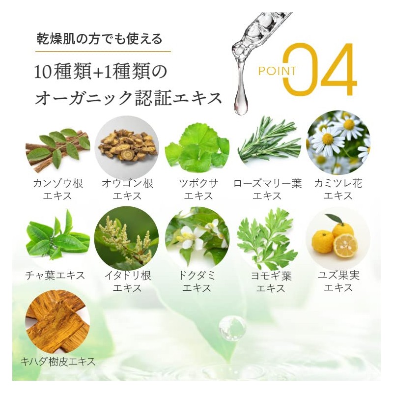 - (Point 04 - Natural Plant Ingredients) Formulated with 10 types of organic certified extracts. Lisopardine Root Extract / Gouron Root Extract / Rosemary Leaf Extract / Kamisley Flower Extract / Cha Leaf Extract / Wadori Root Extract / Horned Dami Extract / Wort Leaf Extract / Yazu Fruit Extract/ Kihada Bark Extract
