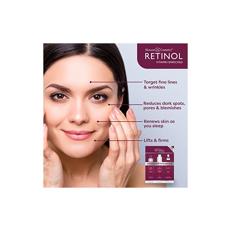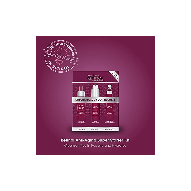 Retinol Super Starter Kit Supercargado con la probada potencia de vitamina A. Los productos Super Retinol estn enriquecidos con vitaminas C y E.