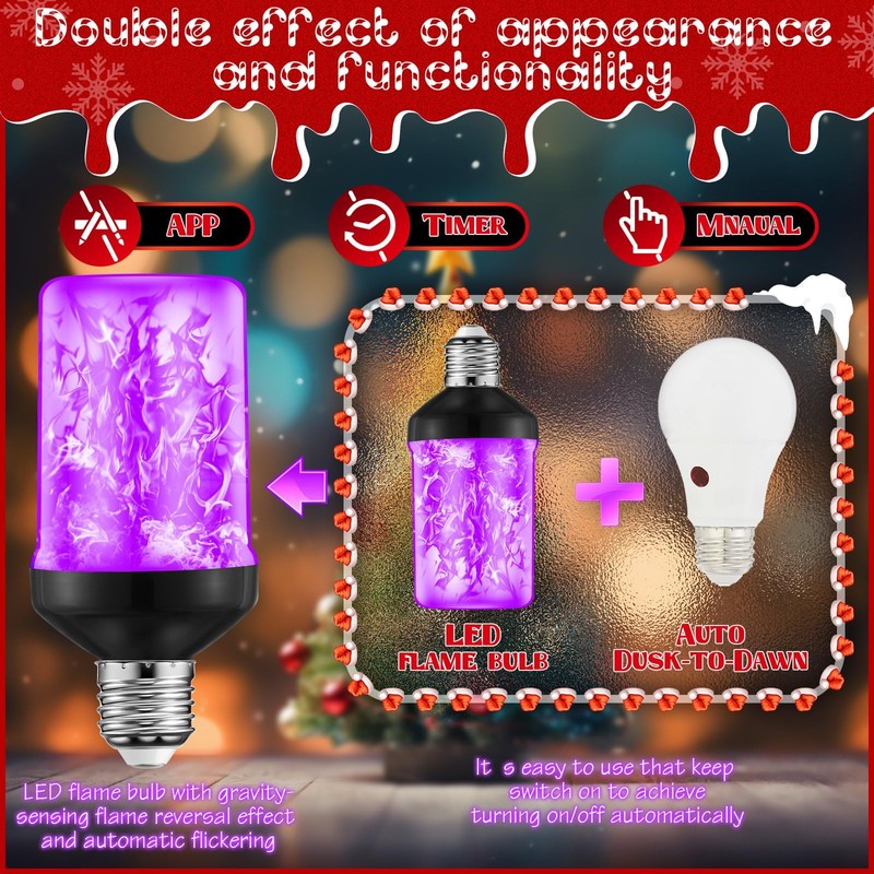 Retisee LED flame effect bulbs are a warm lighting choice that adds a touch of elegance and comfort to your space, mimicking the look of gas flames to create an inviting atmosphere year round. With a built in dusk to dawn sensor, these bulbs automatically light up at sunset, making them perfect for porches, living rooms, or outdoor lanterns. Simply keep the light switch on, and let the sensor provide effortless, cozy lighting every evening.