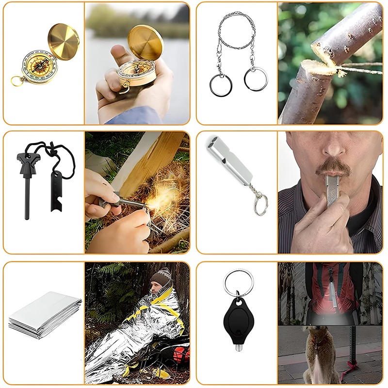 - The necessary set for outdoor use - survival equipment will be useful many times in all conditions you are outdoors. The set will be useful in the wilderness, climbing, camping, survival training, bushcraft, hunting, hiking, excursion, fishing or in an emergency. Even if you are not planning a trip to the fresh air, it is worth keeping such a set in the glove compartment of your car - just in case.