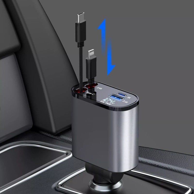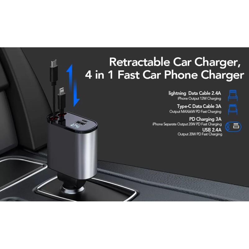 Retractable Car Charger 4 in 1 Fast Car Phone Charger 120W with USB Type C Cable