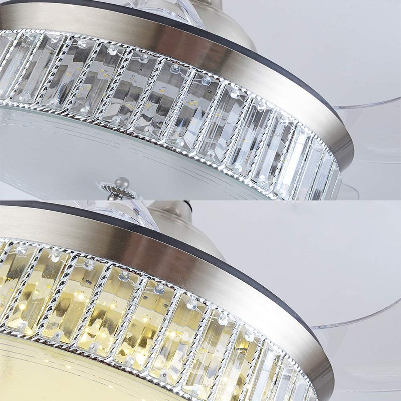 **This modern ceiling fan with lights is a combination of ceiling fan and crystal chandelier:** ★As for a ceiling fan, it has 4 retractable blades that can stretch out and put inside automatically when turned on and off. ★That means, when turned off, the blades will put inside and become 'invisible', totally a chandelier with crystal; ★When turned on, the blades will stretch out, and transfer to a traditional ceiling fan with lights. ★This chandelier fan is controlled by remote control, ceiling fan speed and LED light can be controlled separately by a single remote control. ★Search for the store name Clear Lighting to get more beautiful ceiling fans with lights. **Fan Chandelier Features:** ♥Pendant Lights Type: Crystal Pendant Lights ♥Material: Stainless Steel+k9 crystal+ABS fan ♥Size: 36 inches ♥Color: Silver/Rose Gold ♥Style: modern ♥Process: chrome ♥Number of Blades: 4 ♥Lighting Features: dimmable, fan light ♥Application Type: Indoor ♥Light Bulb Type: LED ♥Number of lamps: 10 ♥Power: 41W (inclusive) -50W (including) ♥Applicable Places: living room/bedroom/kitchen/office and restaurant ♥Voltage: 110V/220v **Please Note:** ▲The actual color of the chandelier may be deviated due to the color of the display and the angle of the picture. ▲Please receive the actual color of the goods as standard, thank you for your understanding and support.