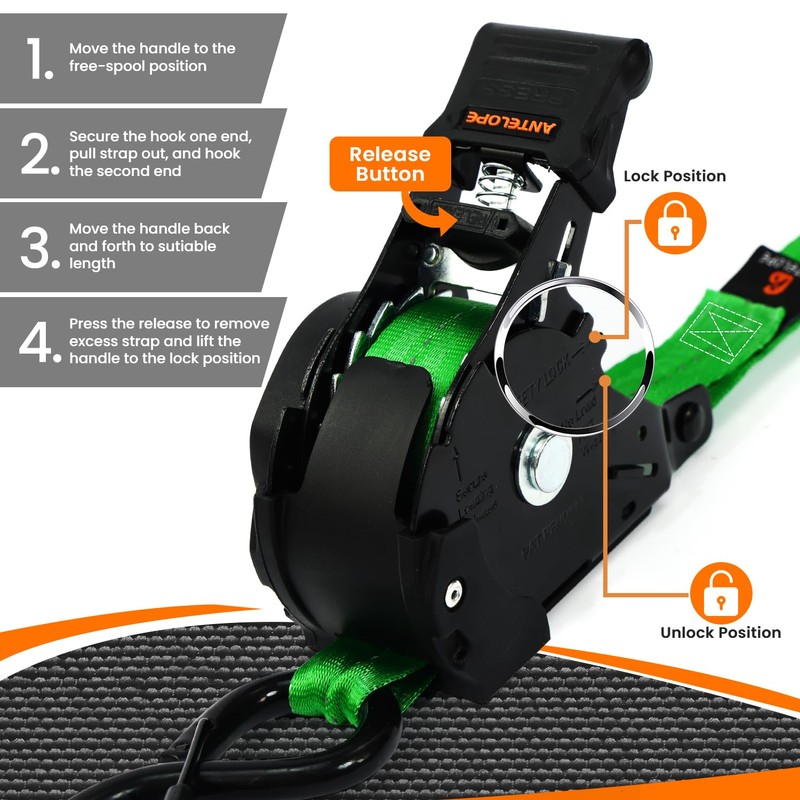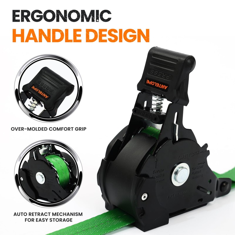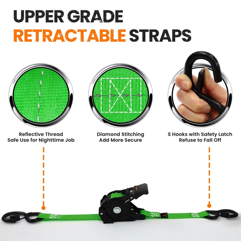 - Secure & Reliable: ALL our retractable straps have TÜV safety certificate, metal parts have Cr-6 free test. You can fully trust our self retracting ratchet straps
