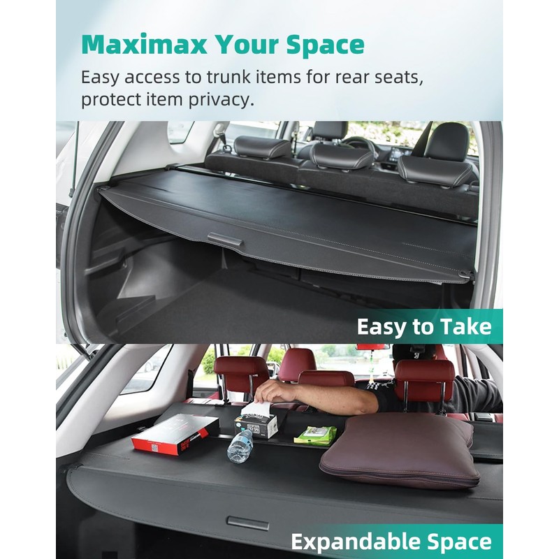 - Gapless Design: The trunk cover completely fits the contours of the trunk and can be perfectly installed in your trunk. The shape is simple and the appearance is fashionable. Easy to install and remove, no drilling required to avoid damage to your car. The luggage compartment lid handle allows you to stretch the luggage compartment lid freely and flexibly