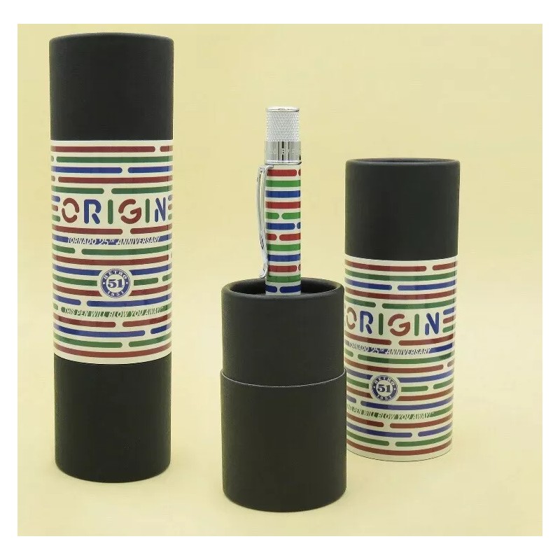 This Tornado special release honors the first three tornado pen colors. "Origin" incorporates red, green, and blue horizontal stripes cascading down a cream barrel. To finish this collectible design, the top disc replicates the line pattern with the number "25" in the middle. This pen is a "must have" for fans from the beginning, a great introduction for newer fans, and a soon to be keepsake for everyone.