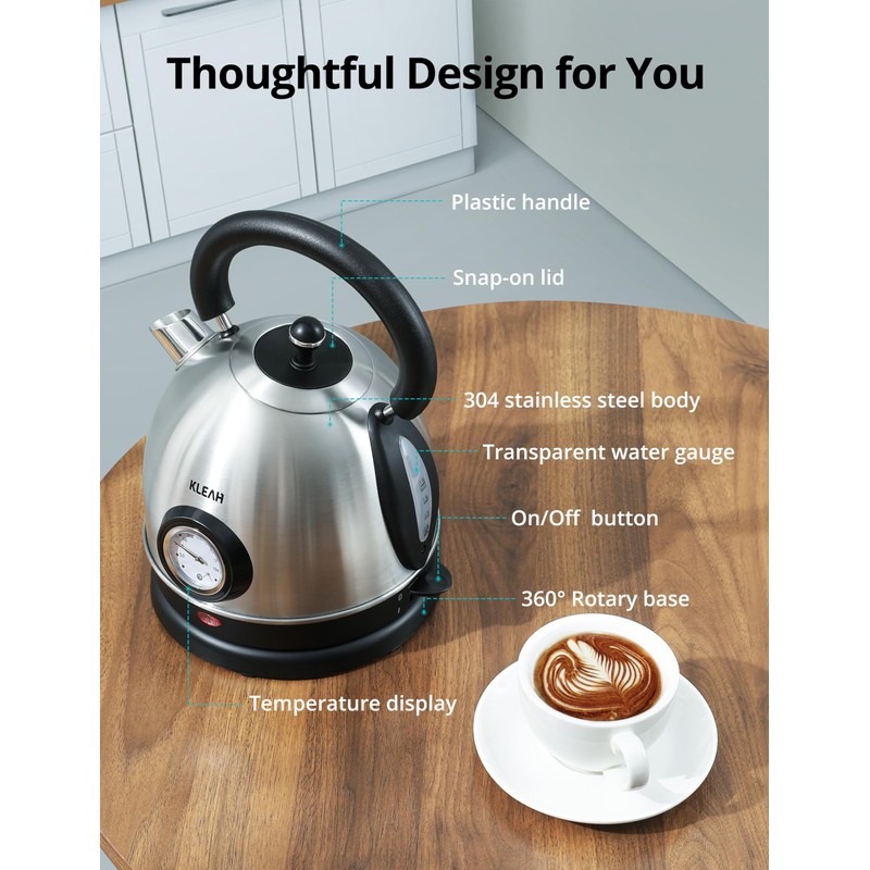 - Large Capacity for Family: This electric tea kettle can heat 9 cups of water, illuminating the power switch when it's on and turning it off automatically once it's done. Elegant retro-style will add a unique touch to your kitchen décor. The curved design is designed to fit your hand better and keep pouring easily.