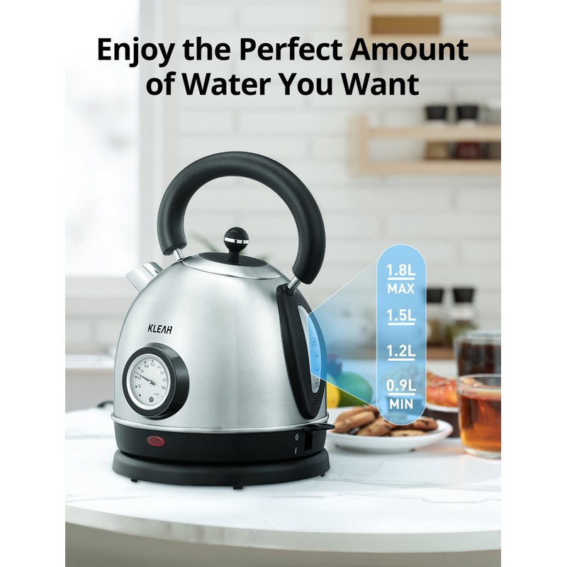- Fast Heating: With 1500W rapid-boil system and temperature gauge, our electric tea kettle can quickly boil 1.8L of water in 7 minutes. It is more convenient for you to prepare hot water, quickly enjoy tea, water and coffee without waiting.