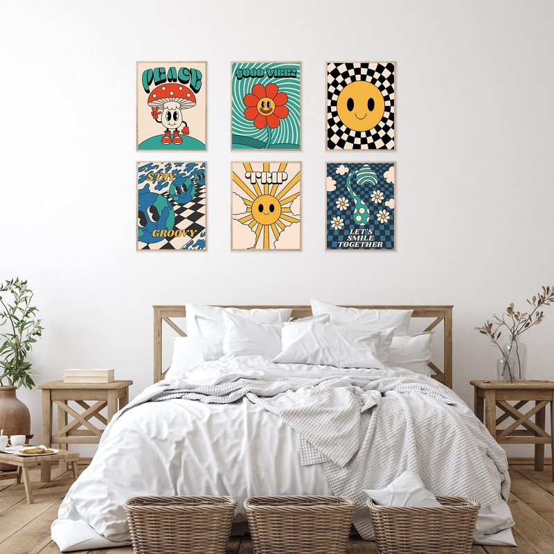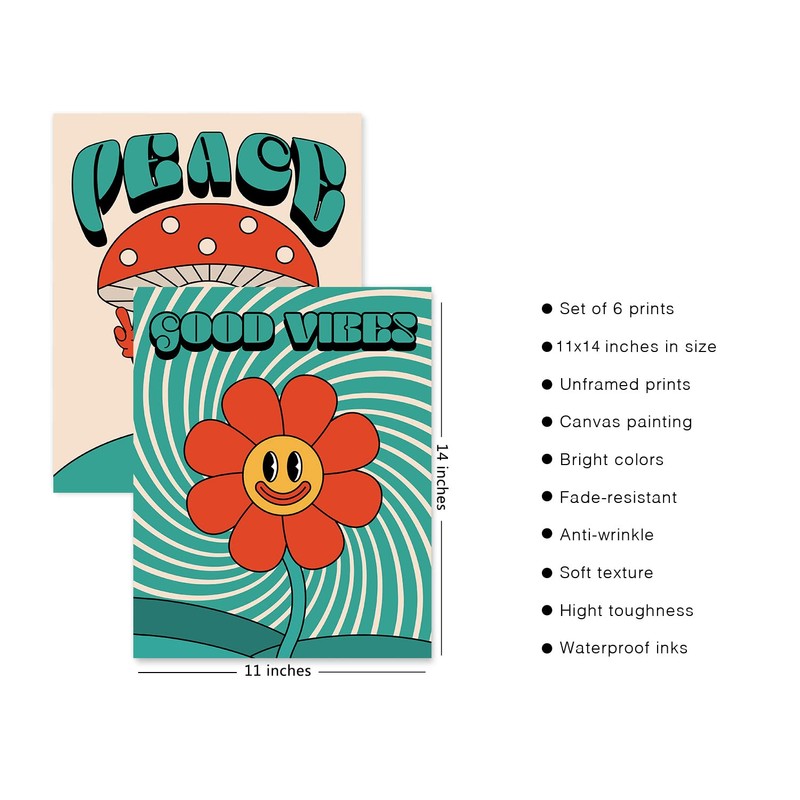 - MODERN WALL DECOR - Decorate your home with 60s 70s retro hippie wall art poster. They will fit perfectly and can become a part of an elegant interior of your Living room, bedroom, kitchen, bathroom, gym, office, workspace, dorm room and anywhere you can think of.