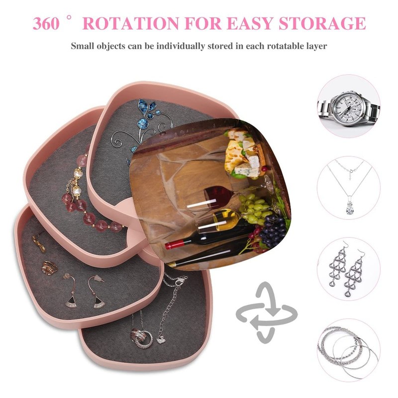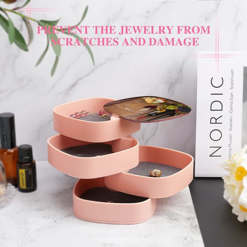 - 4-layers rotating jewelry organizer: can be rotated 360 degrees, easy to put in or take out. Keep all in one place and neatly organized. No tangle, no loss, no damage. Spacious enough for carrying your necklaces, chains, rings, earrings, hair accessories, watches, etc.