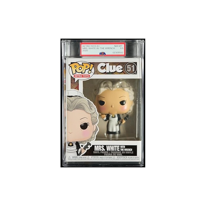 Retro Toys: Clue™ Mrs. White w/The Wrench™ Collectible Vinyl Figure #51, Fully Encapsulated Bundle with Compatible Funko™ Pop!™ PSA Hard Protector Case, PSA Graded 8.5 NM-MT+